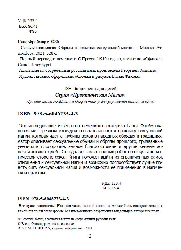 "Это исследование известного немецкого эзотерика Ганса Фреймарка позволяет трезвым взглядом осознать истоки и практики сексуальной магии, которая идет с глубины веков в народных обрядах и традициях. Автор описывает сексуальные обычаи и обряды прошлого, призванные увеличить плодородие, земное благосостояние и другие земные аспекты жизни людей. Это одна из самых полных работ по оккультно-магической стороне секса. Книга поможет выйти из ограниченных рамок отношения к сексуальной магии и, возможно, поспособствует лучше понять силу сексуальной магии и возможности её применения в магической практике."