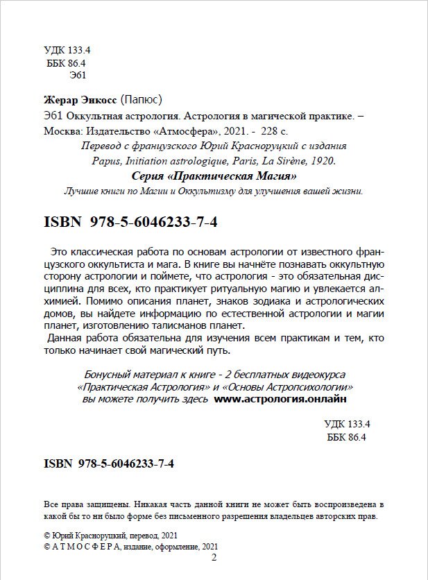 "Это классическая работа по основам астрологии от известного французского оккультиста и мага. В книге вы начнёте познавать оккультную сторону астрологии и поймете, что астрология - это обязательная дисциплина для всех, кто практикует ритуальную магию и увлекается алхимией. Помимо описания планет, знаков зодиака и астрологических домов, вы найдете информацию по естественной астрологии и магии планет, изготовлению талисманов планет.