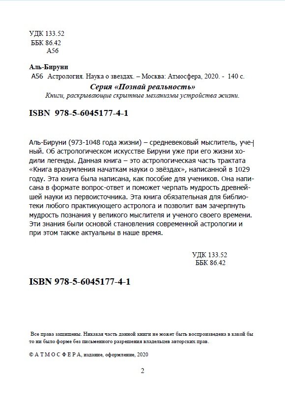 "Аль-Бируни (973-1048 года жизни) – средневековый мыслитель, ученый. Об астрологическом искусстве Бируни уже при его жизни ходили легенды. Данная книга – это астрологическая часть трактата «Книга вразумления начаткам науки о звёздах», написанной в 1029 году. Эта книга была написана, как пособие для учеников. Она написана в формате вопрос-ответ и поможет черпать мудрость древнейшей науки из первоисточника. Эта книга обязательная для библиотеки любого практикующего астролога и позволит вам зачерпнуть мудрость познания у великого мыслителя и ученого своего времени. Эти знания были основой становления современной астрологии и при этом также актуальны в наше время."