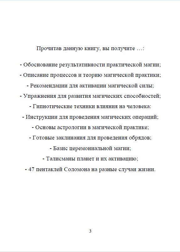 "Это классическая работа по основам практической магии от известного французского оккультиста и мага. В книге вы познакомитесь с научным обоснованием результативности применения магии, получите описание процессов, происходящих при магическом действии, а также получите набор рекомендаций для активации в себе магической силы и начала магической практики. Также в книге присутствуют инструкции и готовые заклинания для проведения магических операций, основы церемониальной магии, магической астрологии, изготовление планетарных талисманов, гипнотические техники влияния и многое другое. Бонусом к книге прилагается 47 пентаклей-талисманов Соломона на разные случаи жизни. Данная работа обязательна для изучения всем практикам и тем, кто только начинает свой магический путь."