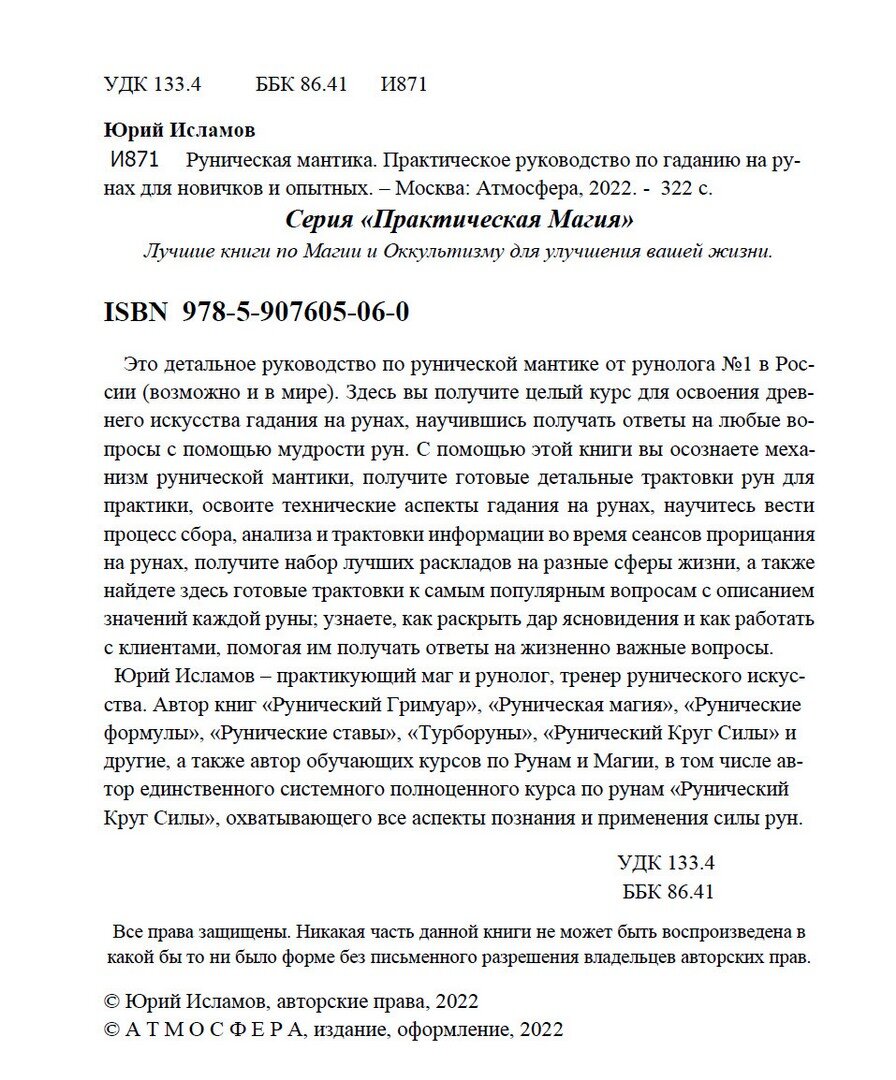 Юрий Исламов – практикующий маг и рунолог, тренер рунического искусства. Автор книг «Рунический Гримуар», «Руническая магия», «Рунические формулы», «Рунические ставы», «Турборуны», «Рунический Круг Силы» и другие, а также автор обучающих курсов по Рунам и Магии, в том числе автор единственного системного полноценного курса по рунам «Рунический Круг Силы», охватывающего все аспекты познания и приме-нения силы рун."